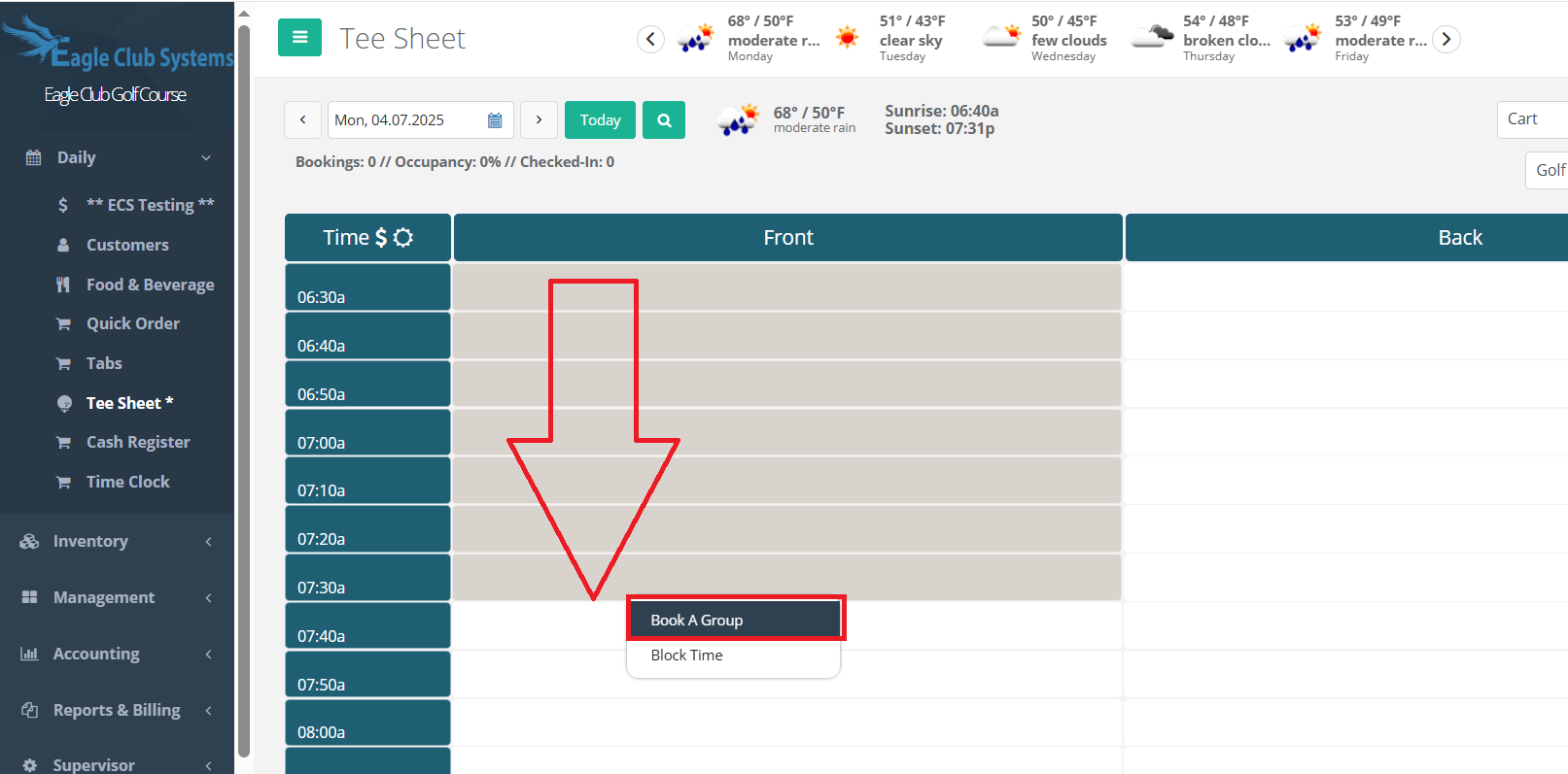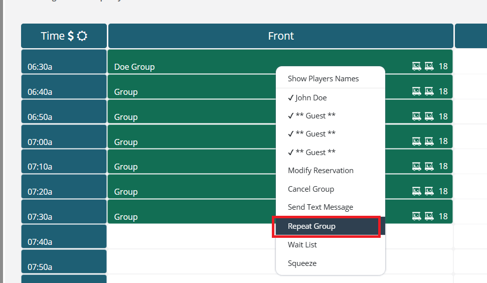Step 1: Click and drag the times you wish to book. Example: click 6:07 AM and continue holding down the mouse and drag down to last time you want to book. (If on a tablet/touch screen, click the first tee time, then in reservation details, click the + sign and select number of players for the group.