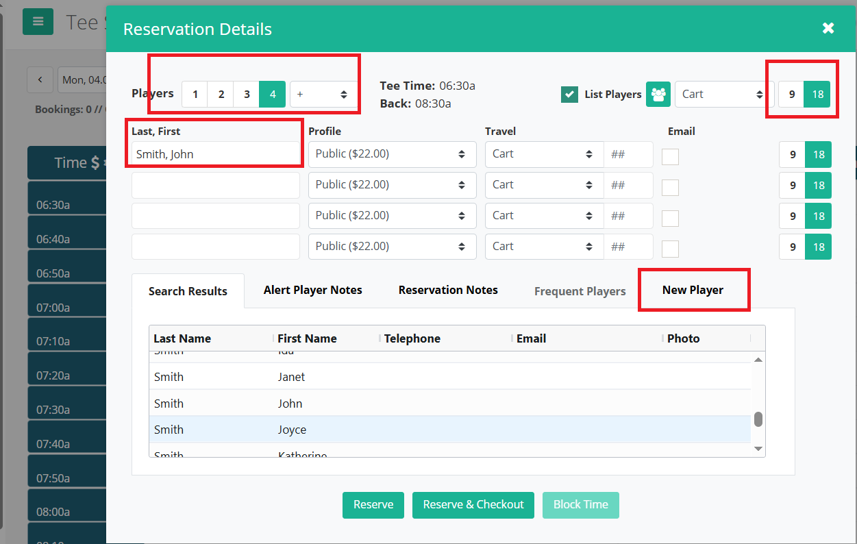 Step 4: Be sure all "required" fields are completed before clicking "Reserve". If customer is not found in the database, click the "New Player" tab. Fill out the required fields, then hit save player and then you can reserve the tee time in that players name.