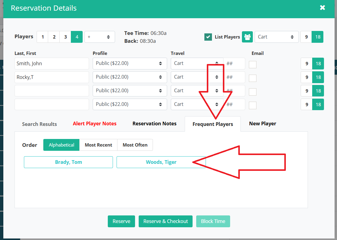 - Utilize the "Frequent Player" tab for quicker booking of all golfers in the tee time/group. The customer's "frequent players" will continue to update as the customer plays with additional players.