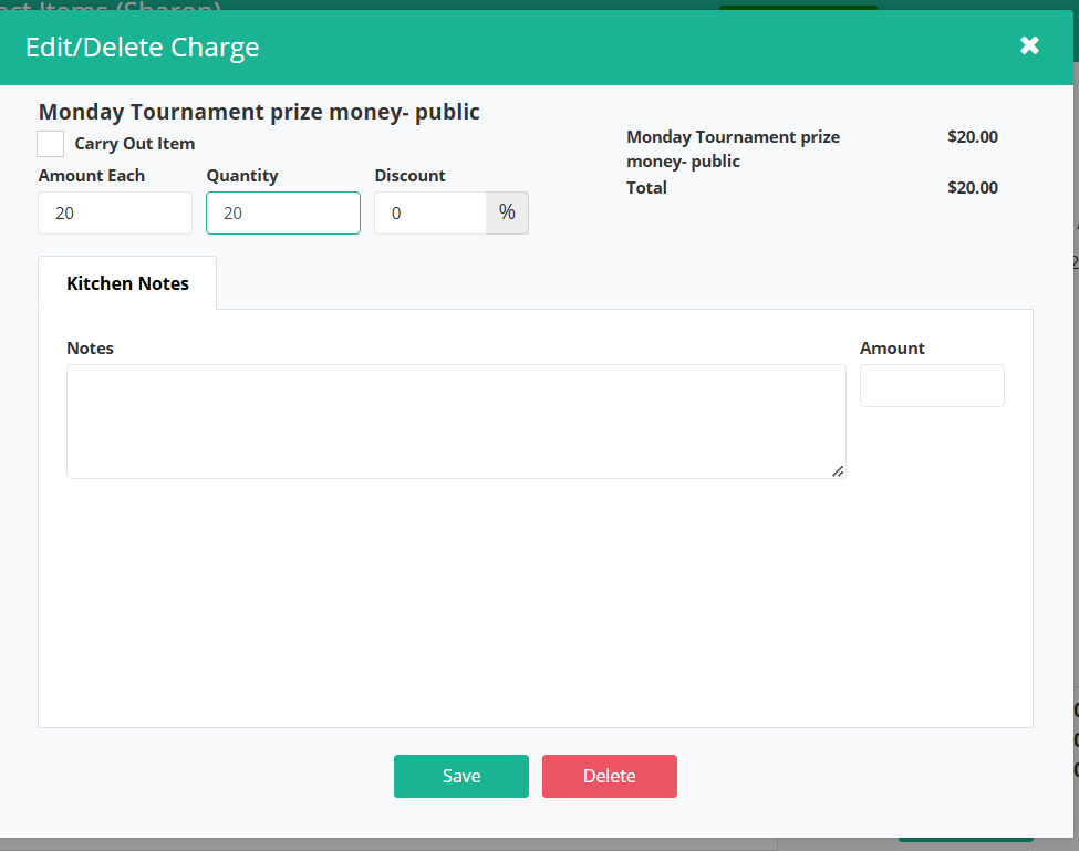 In Quick Order, ring up the Prize Money for the players participating. For example, 20 players paid $20 each.