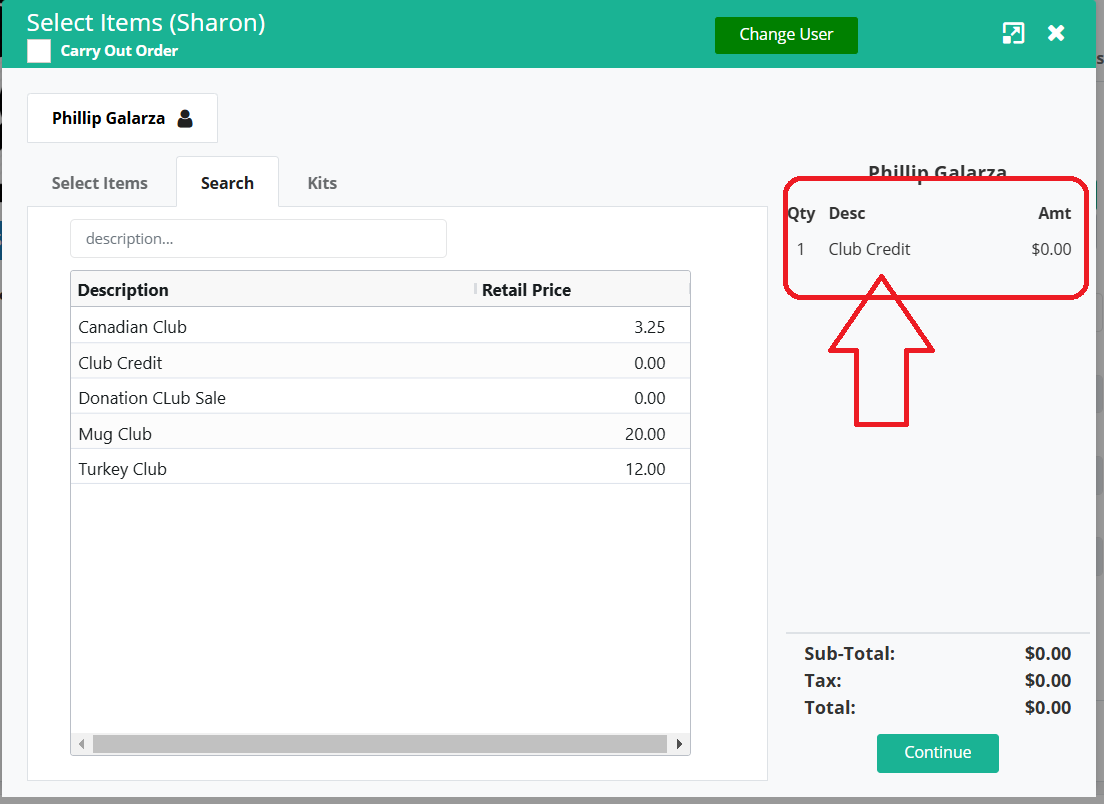 When you want to distribute the prize money, go to Quick Order and choose your customer. You will choose Club Credit as your item and click on it on the right side, then, in the box that pops up, fill in the amount. In this case $50.00. Save.